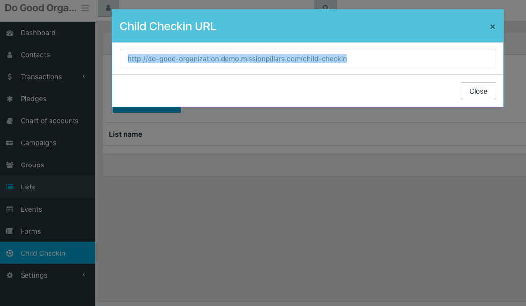Once inside your Mission Pillars account locate/(click on) "Child Check In" on the left Menu. A URL will populate to launch your Child Check In. Copy and paste the URL into another browser.