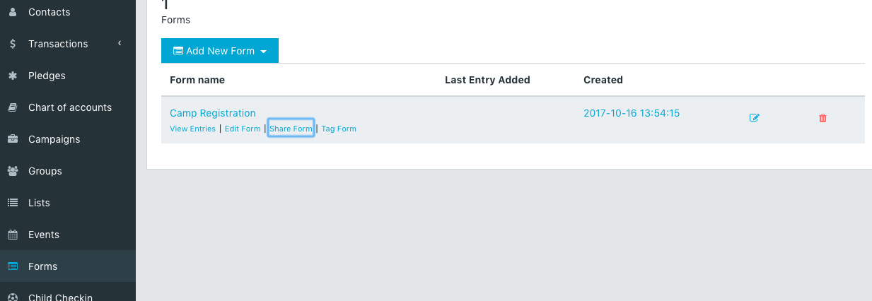 5. Once you have your form the way you want it, it's time to share this form or attach it to a group or event sign up. Go back to all your forms and choose to share. You can share the link or embed in your website.
